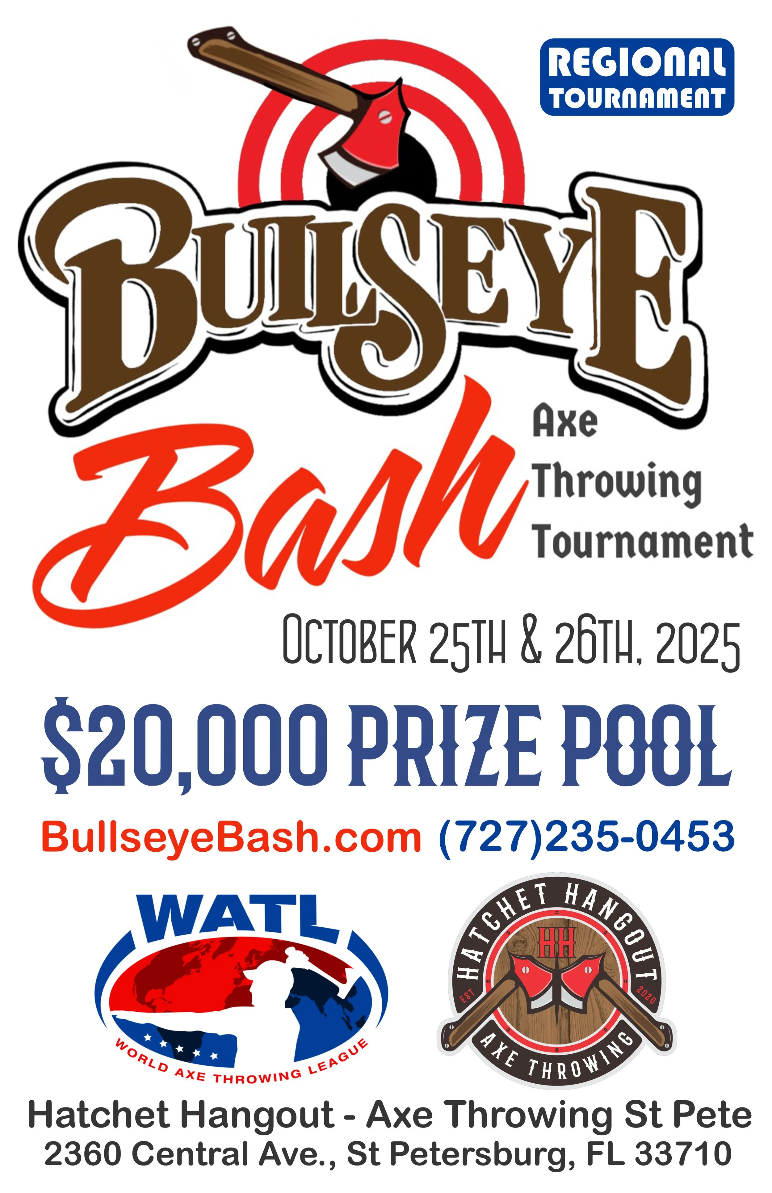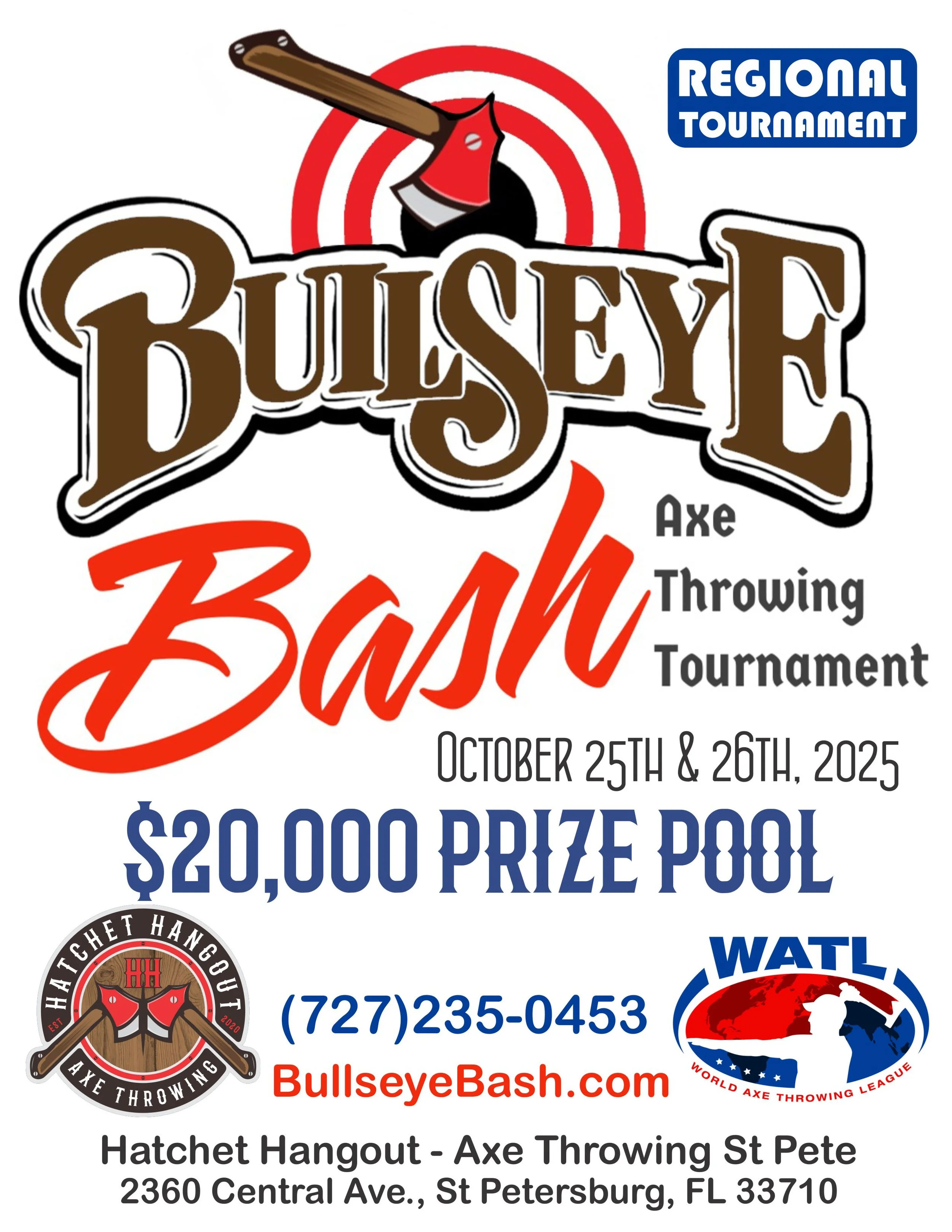 Bullseye Bash: Regional Tournament is an official tournament of (WATL) World Axe Throwing League. The WATL is the global governing body of urban axe throwing founded in 2017 by representatives from the U.S., Canada, Brazil and Ireland. It represents 19 axe throwing nations and more than 130 member companies.